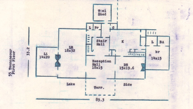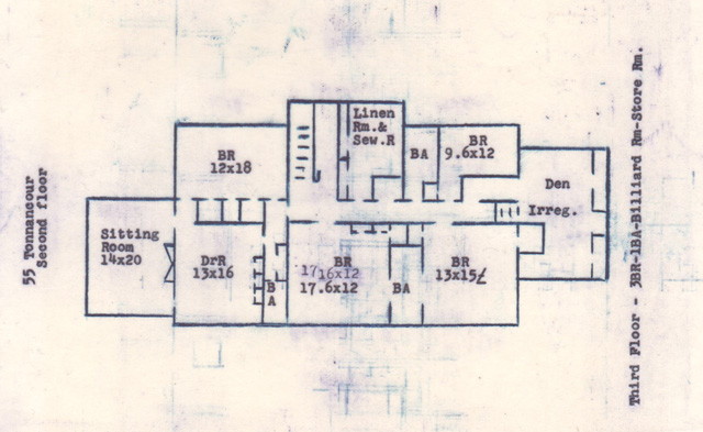 It is a classically styled symmetrical three-story residence. There is a large stone embedded in the outside wall of the house, which is engraved "Tonnancour” 1914. The interior features a large 18’x15’ sq ft reception hall, a grand 18’ x 32’ sq ft living room (with fireplace) along with a 14’ x 20’ sq ft library, and a 19’ x 15’ sq ft dining room – both rooms have fireplaces, while the library (at one point) also had a bar. There were five bedrooms in total, with an additional three on the third floor for servants. The second floor also had a large 14’ x 20’ sq ft sitting room on the side of the home. Color image courtesy of GoogleEarth.