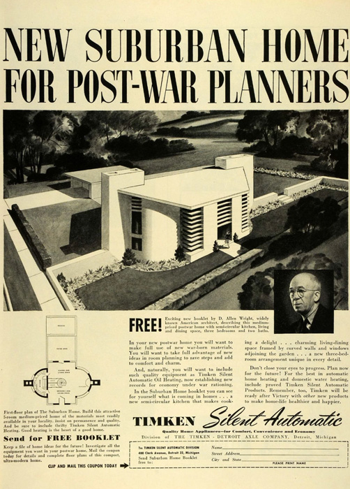 By the early 1940’s Wright was a nationally recognized architect, specializing in medium priced state of the art homes. In a booklet produced in conjunction with Timken, a division of the Detroit Axle Company, it is apparent Wright was instrumental in designing a modern innovative home complete with a semi-circular kitchen, and a living-dining space, framed by curved walls and windows. Below is a copy of a print ad from the booklet. Image courtesy of: periodpaper.com