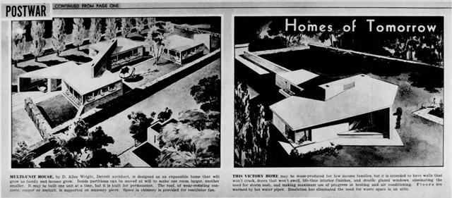It was reported Mr. Wrights post war plans were “homes to meet the 30-billion-dollar demand of tomorrow.” The article explained “Wight planed on making full use of the new “miracle” materials and construction methods. They would be permanent yet flexible, so they could be enlarged to meet growing family needs with partitions that could be moved at will to make one room larger, or another smaller. They would combine privacy with plenty of light and living space and would contain conveniences unknown in the past. They would save steps, save work – and above all, save upkeep cost.”