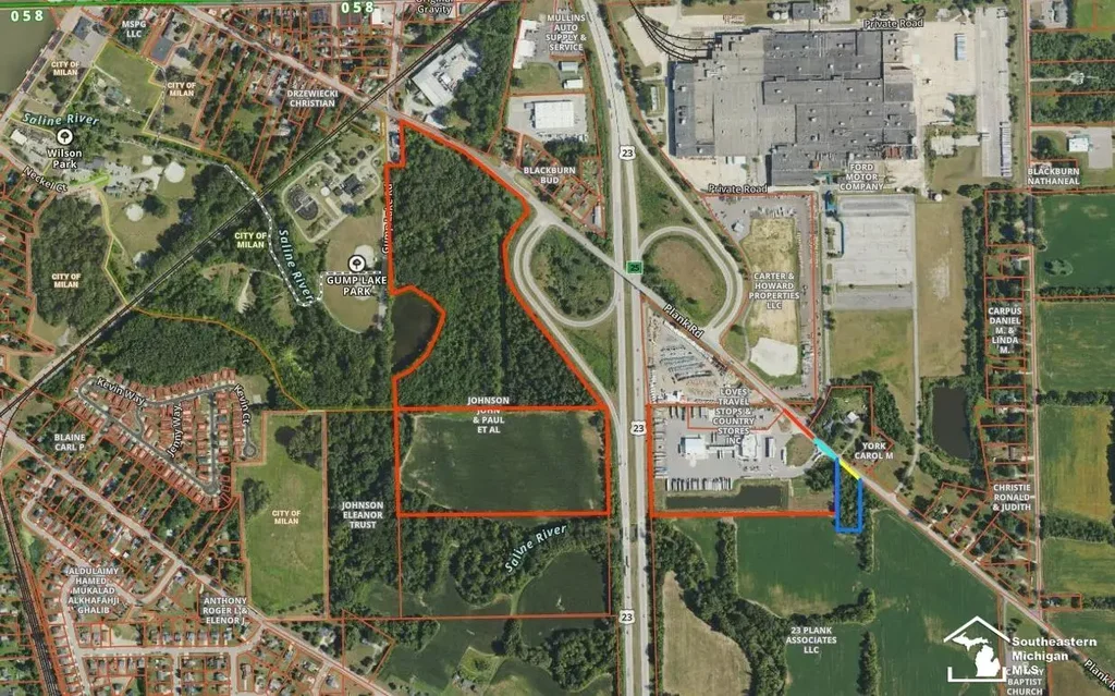 US23 Highway Development Opportunity in growing Milan, MI!!! Located on the SW intersection of US23 (Plank Road exit) with 725ft. of highway frontage and 200ft. of Main St. frontage. 3 parcels, offered together, consisting of approx. 47+/- acres--Highway Commercial and Mixed use Residential Zoning. The Property offers great visibility from the highway interchange and is wooded with a clearing off Main St. It also abuts Gump Lake and City of Milan owned Properties. The southern parcel is currently being farmed and parallels the highway. City Water, Sewer, and Natural Gas are available at the street. Second Parcel ID#58-53-040-257-00 (Parcel C). Part of Parcel D - Parcel ID#58-53-040-262-00 will be included subject to land division. The time has come for you to visit Milan soon, I promise you will not be disappointed.