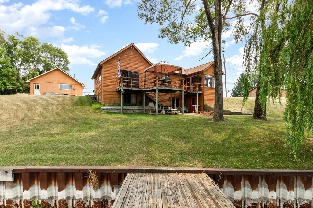 Lakeside Living with Over 200' of Prime Wixom Lake Frontage! Welcome to 5770 Dundas Rd — a rare opportunity to own over 200 feet of water frontage on Wixom Lake in one of the most desirable locations. This spacious ranch-style home with a full walk-out basement sits on a beautifully elevated lot with panoramic water views, mature trees, and open green space. The main floor offers over 1,200 sq ft of living space, including an updated kitchen with custom oak cabinetry, double wall ovens, and a bright dining area that flows seamlessly into a cozy living room with large windows and incredible lake views. Off the living area, a sunroom provides peaceful scenery year-round and connects to a wrap-around deck with a charming gazebo — ideal for relaxing or entertaining above the waterline. The master suite features a walk-in closet, private bathroom, and its own access to the deck. An additional office on the main floor makes working from home a breeze. Downstairs, you'll find a large family/game room with walk-out access to a covered patio and firepit area, along with two more bedrooms, a full bath, and a generous laundry room. The exterior boasts multiple outbuildings, including two detached 2-car garages, offering excellent storage and workshop potential. A steel seawall, suspended dock, and wood siding add both functionality and character to this lakeside retreat. Located just off M-30 on a paved road, enjoy quick access to US-10, Midland, and all the recreational opportunities Wixom Lake has to offer.