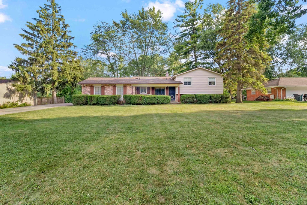 Maintanence free 4 bdrm Quad with plenty of room to roam for everyone!If you like your elbow room, you will LOVE the size of this lot!Kitchen with peninsula,pantry, desk area, all appliances stay!Cozy breakfast nook with ceiling fan & picture window with view of the inviting front porch, perfect for your morning coffee or your evening beverage!Formal dining rm with generous over sized doorwall to picturesque view of tree & shrub lined expansive yard & exrta large shed at back of property to store all of your toys!Spacious family rm with brick surround frplc & lrg picture window which allows an abundance of natural light,adjacent to bdrm with full bath across the hall.Walk down to the finished lower level that houses the washer, dryer & stove that are included.Hrdwd flrs in 3 upper bdrms.Primary bdrm with dual entry to full bath.All bdrms with ceiling fans.Hardwood under carpet in hall, stairway to upper level & formal dining rm. Many of the windows have been replaced with vinyl clad windows. 2 1/2 car garage. Brand new (10/2025) Electrical Panel!Original owners took great care of this home and it shows! Be prepared to fall in love!