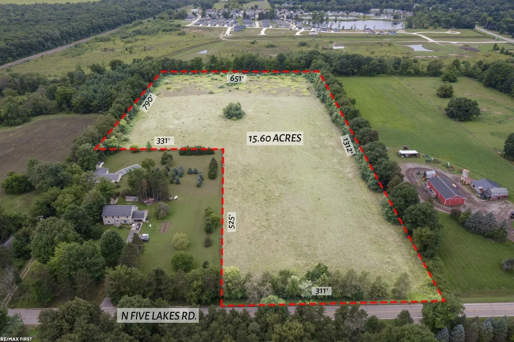 Welcome to a sparling, picturesque and tree lined parcel with over 15 acres of open land. Situated off PAVED N Five Lakes Road with 311' of road frontage, this parcel opens up to approximately 651' wide as you move towards the back of the parcel. A perfect place to build your dream home with room for all your toys and out buildings. The property has no wet lands, has been cleared and is flat, perfectly positioned for new home or your farming dreams. Conveniently located with easy access to I-69, M-24 and M-53. The property is located off N Five Lakes Road between house numbers 115 and 369. The property has been used for hunting, do not walk the property without an appointment.