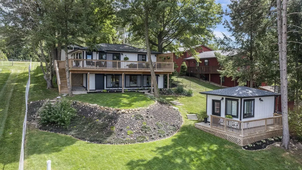 Looking for a peaceful, turnkey lakefront retreat with modern conveniences? This one-of-a-kind, fully rebuilt four-season waterfront home on the private, spring-fed Minnewaukan Lake in southwest Michigan offers the perfect escape. Ideally located just 2.5 hours from Chicago and less than 3 miles from the charming, historic downtown Sturgis, this property combines tranquility with accessibility. Set on a beautifully landscaped and mature.3 acre lot, the home features 75 feet of private sandy beach and a separate, fully insulated four-season bunkhouse — a rare and valuable addition. Surrounded by lush perennial gardens and mature trees, the grounds are as inviting as the home itself. The small, quiet subdivision is just minutes from shopping, dining, and all the conveniences of town. The main residence was completely taken down to the studs and reimagined with a thoughtfully expanded floor plan and top-of-the-line materials throughout. For a comprehensive overview, please refer to the attached list of upgrades and improvements. This property is truly a rare gem — a “unicorn” among lakefront homes — and must be seen to be fully appreciated.