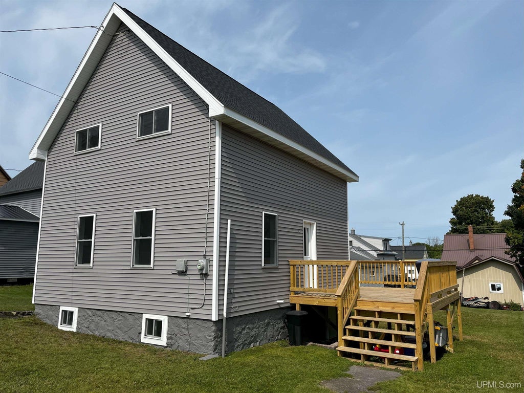 3BR/1BA updated, energy efficient home with a new large deck. The exterior of the home has been completely updated with new siding, windows, roof and deck in summer of 2025. Enter the home from the front deck. The living room, remodeled kitchen and bathroom are on the first floor. The living/family room area is two rooms and connected to the kitchen with a large pass-through opening. The kitchen is warm and inviting with new cabinets, countertops and sink with a big picture window overlooking the backyard. Upstairs has three bedrooms connected with a central hallway and hardwood floors throughout. The third bedroom is accessed through either of the other bedrooms. The basement is dry with storage space and features the laundry area, newer furnace, water heater, plumbing, and electric service. The large deck has space to sit, relax, and enjoy the views of the yard. The home is conveniently located within 5 miles of Houghton. Near all the amenities that Houghton and Hancock have to offer, Michigan Tech, and the area hospitals. Schedule your showing today and don't miss out on this must-see, updated home!