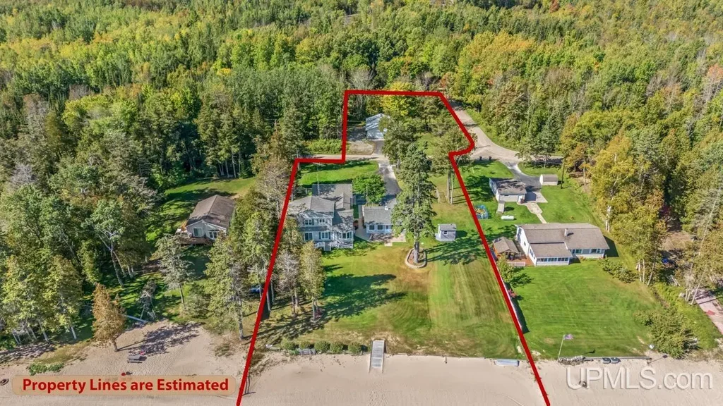 GORGEOUS SAND BEACH ON LAKE MICHIGAN – 2.45 ACRES! Rare opportunity with approximately 145 feet of pristine sand beach! This 3-bedroom, 3-bath, 2,258 sq. ft. home is beautifully updated and move-in ready. The open-concept main floor features a living room, kitchen, dining area, and home office, all with stunning lake views, plus an en-suite bedroom. The entire upper level is another spacious en-suite bedroom, perfect as a primary suite, family room, or convertible into additional bedrooms. The fenced yard is ideal for pets, and a small retaining wall separates the grass from the sand.  The main house has seen many major updates, including a new roof, new windows, composite deck, fresh paint, rebuilt chimney, storm doors, and gutters, all with a completely maintenance-free exterior, providing a worry-free living experience. Also included is a 1,040 sq. ft. guest cottage, fully furnished and ready for guests, which also features a maintenance-free exterior. Additional buildings include a 24x30 pole building on its own acre with cement floor and power, as well as an attached garage with breezeway/sunroom plus a heated, insulated bonus shop/room. The property also offers Highline high-speed fiber internet and is just 20 minutes to Escanaba.  Lovingly maintained and updated, this property is perfect for family gatherings, entertaining, or as a vacation rental opportunity, combining lakefront living, spacious accommodations, and low-maintenance buildings in a truly special setting.