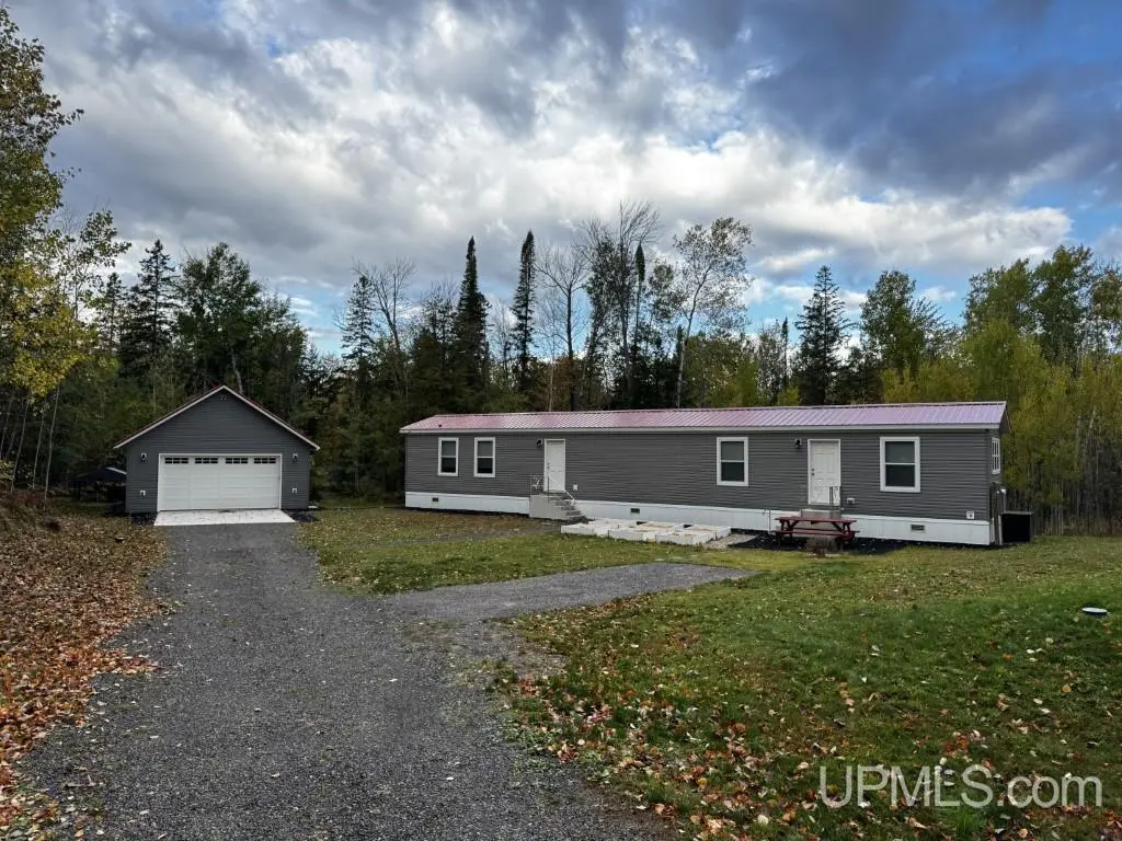 Very well maintained 3 bedroom, 2 full bath manufactured home built in 2021, featuring a detached 24x30 two car garage with power that was newly built in 2024! This home offers a modern, comfortable feel with tasteful vinyl flooring, recessed lighting, and crown molding throughout. Step inside to an open-concept living area with a spacious living room that flows seamlessly into a bright kitchen with countertop seating, plenty of cabinet space and soft-close drawers. The layout offers privacy, with the primary suite situated at the back of the home featuring a full bath and walk-in closet. Two additional bedrooms and another full bath are located toward the center of the home, perfect for family or guests and the washer and dryer hookups are conveniently located off the hallway for easy access. Major upgrades include central air conditioning, a water softener system, a craftsman storage shed, and a 22kw Generac propane generator that automatically powers the home and garage during outages. Set on 20 acres of beautiful forest, this property offers peace and privacy with trails and abundant wildlife right out your back door. Located just 12 miles from downtown L’Anse and close to Lake Superior, Point Abbaye Peninsula, beaches, parks, and ATV/snowmobile trails! You’ll love everything this property has to offer!