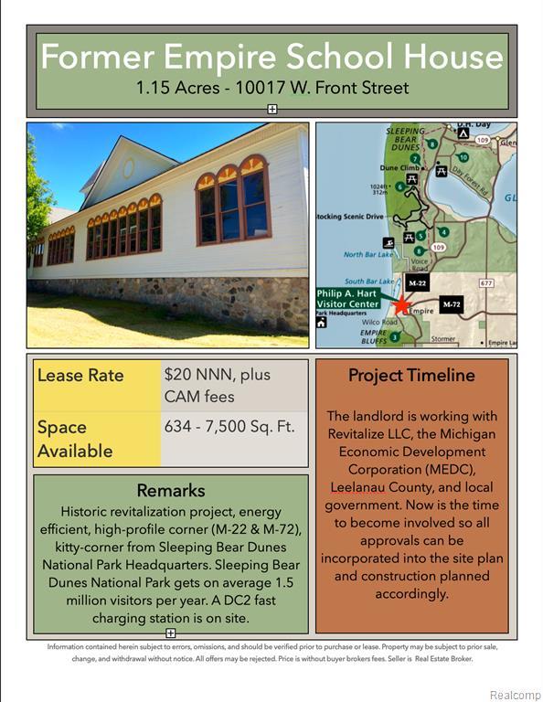 Historic Restoration at the major intersections of M-22 and M-72. High exposure! Sleeping Bear Dunes National Park gets on average 1.5 million visitors per year. Being done in cooperation with Revitalize, LLC and the MEDC. Act now to have your space included in the approval process and done the way you want it. Tenant to be provided a vanilla box with energy efficient utilities. Space / Square Footage details listed in the property brochure. Please call for a full brochure. Price is $20.00 psf NNN plus CAM fees. This is a Net Net Net Lease with C.A.M. fees. One months rent security deposit. All data & measurements are approximate and should be verified.
