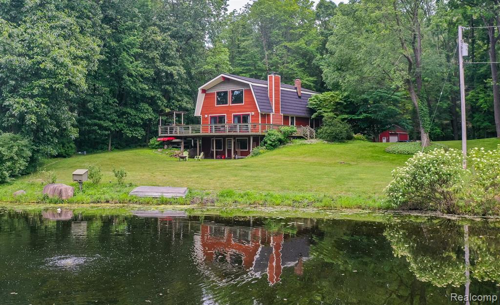 Nestled on over 15 picturesque acres with a winding drive, private pond, and scenic trails, this charming farmhouse-style colonial backs directly to Indian Springs Metro Park, offering unparalleled privacy and access to nature. A true retreat, this home seamlessly blends rustic charm with modern updates. Step inside to a spacious kitchen featuring a classic farm-style sink, butcher block countertops, a huge island with a gas cooktop and seating area, and stainless steel appliances, including a new refrigerator (2024). The soaring ceilings and large windows in the great room flood the space with natural light, while the open-concept eat-in kitchen flows effortlessly to the deck - perfect for entertaining. Just steps away, a generous living room boasts an incredible stone wood-burning fireplace, creating a cozy atmosphere. The first-floor primary suite offers a large walk-in closet and an adorable en-suite bath with a shower. Upstairs, enjoy all-new laminate flooring and trim, three bedrooms (one currently used as an office), and a full bath with a jetted tub and shower. The walk-out lower level features a cozy den and bar area that opens to a patio - ideal for relaxing or hosting guests. Outside, the expansive deck is equipped with a grilling station with electricity, making outdoor dining a breeze. Sit back and soak in the breathtaking views while watching wildlife in your own private sanctuary. Recent updates include a premium shingle-look Erie metal roof with insulation and a lifetime warranty (2022), well pump and pressure tank (2024). Great room professionally painted (2025). Durable Hardie board exterior. The 30 x 40 pole barn with electricity and a chicken coop complete this incredible property, offering endless opportunities for hobbyists or homesteaders. Don't miss your chance to own this one-of-a-kind country escape! See the 3D tour for a virtual walkthrough.
