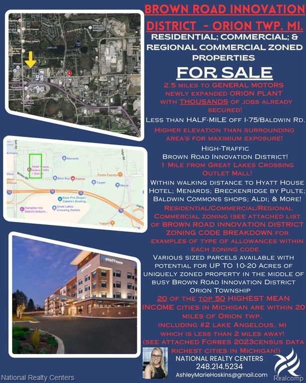 PRIME REAL ESTATE OPPORTUNITY – RIGHT OFF I-75! This .65 acre property (which can be combined w/ adjoining properties for more acreage!) is set on higher elevation than most of the surrounding businesses, featuring unique multi-zoning flexibility to support retail, residential, office space, drive-thru, indoor/outdoor storage, & more! Located within Brown Road Innovation District RIGHT NEXT DOOR to Menards, Breckenridge by Pulte Homes, the new HYATT HOUSE Hotel, & more! Direct access to I-75, minutes from Great Lakes Crossing & The newly expanded GENERAL MOTORS ORION PLANT (set to be one of the largest in the COUNTRY!)! Surrounded by highly developed Brown Road & Baldwin Road in Orion Township, this location could have constant visibility & high traffic volume - prime for business or residential success! This property is located within highly sought after Orion Township, Mi but borders many other high median income area's such as Lake Angelous, Mi. / Clarkston, Mi. / Rochester Hills, Mi. / Oxford, Mi. & so much more! The value of this property is in the land but there IS a NEWLY REMODELED home on the property. Details & viewing of interior of the home available upon request. Home is being sold 'As-Is!' Home is occupied. Please do not disturb. Contact Listing Agent to set an appointment to view the land. BATVAI