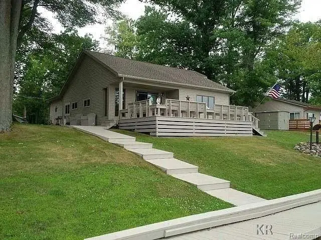 Discover this stunning Wixom Lake waterfront home featuring 104 feet of prime lake frontage! Nestled on just over an acre, this property offers expansive lakefront living with breathtaking panoramic views from the front deck and yard. The well-maintained residence includes a spacious 3-bedroom layout with an open floor plan. Enjoy a beautifully updated kitchen, new wood laminate flooring, and a lakeside master bedroom with charming log-enhanced walls. The natural fireplace and large living room doorwall leading to the deck add to the home's appeal. Additional features include a 14x22 bunkhouse, recently renovated for comfort with heating and window A/C, perfect for family and guests. The 28x40 pole barn, with concrete floors and three garage doors, provides ample storage and easy access. Situated on a double lot that is over 420 feet deep and more than 100 feet wide, this property also boasts towering mature trees and much more.