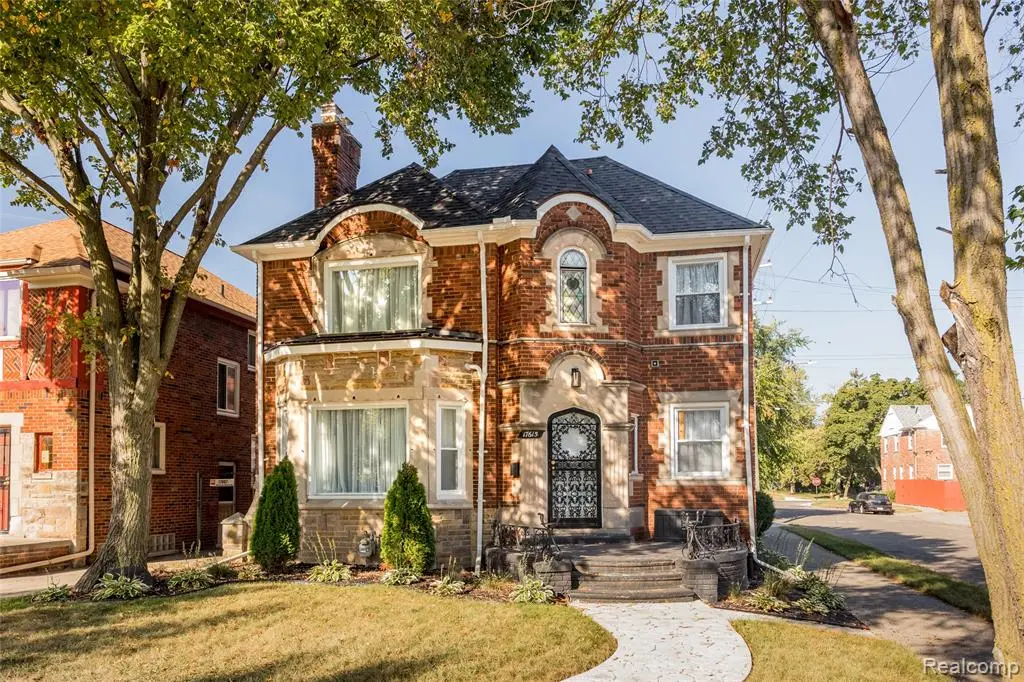 Built in 1932, this move-in ready, corner-lot Colonial offers a perfect blend of original character and modern updates. Completely renovated from top to bottom, the stunning brick showstopper features the best in historic details across all 2,600 square feet, including wrought-iron railings and gorgeously detailed crown molding throughout. The main level includes a huge living room with original fireplace; an office lined with built-in wood shelves; a formal dining room; powder room; sun-room leading to the private backyard; and a luxurious, modernized kitchen with quartz countertops, a six-foot eat-in island and black stainless steel Bosch appliances. The second floor features a large landing, a massive primary suite with en-suite bathroom, totaling four spacious bedrooms and two full baths, plus balcony and tons of storage. In the basement, there is a laundry room, loads of storage and a sizable finished space with original fireplace and top-notch vinyl flooring, perfect as a home gym or flex space. The backyard is a completely private and low-maintenance outdoor living space with privacy fence and paved patio leading to the two-car detached garage. Other improvements include; new concrete driveway, walkways and front porch, new custom metal roof over bay window, sprinkler system and more. Located in the desirable Bagley neighborhood, minutes from the University of Detroit Mercy, Livernois Avenue of Fashion, Bucharest, Kuzzo's Chicken & Waffles, Palmer Park, Detroit Golf Club and more.