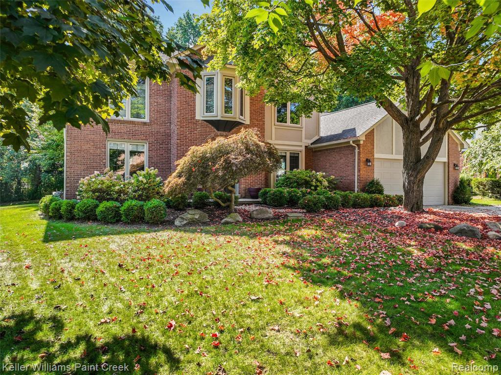 This colonial has great curb appeal with lovely landscaping complete with manicured garden beds and a shady tree. Step inside to a welcoming foyer with sleek ceramic tile, double coat closets, a curved staircase, and a modern light fixture. To the right, a private study with French doors and built-in shelving offers the perfect spot for work or reading. The formal dining room features a bay window, while the open living space offers luxury vinyl plank floors, recessed lights, and ceiling beams. The gourmet kitchen includes granite counters, shaker style cabinets, custom backsplash, a curved island, and stainless appliances including double ovens, French door refrigerator, gas cooktop, dishwasher, and microwave. The breakfast nook has floor-to-ceiling windows that showcase the lovely backyard. The family room highlights a stately fireplace, wet bar, and door to the deck. Upstairs, spacious bedrooms provide ample closet space. The primary suite has a vaulted ceiling, large walk-in closet with organizers, and a spa-like bath with soaking tub, walk-in shower, and two sinks. A second full bath with two sinks serves the additional bedrooms. The finished basement adds versatile living and storage space with a full bathroom and the perfect set up for your media room and hobby space. The backyard offers a large deck ready for entertaining and mature trees.