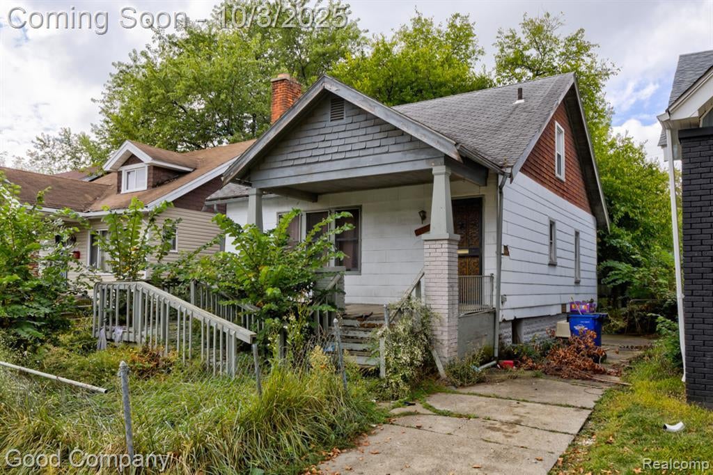Great investment opportunity in Detroit with tons of potential and original charm waiting to be brought back to life. A classic covered front porch welcomes you into a bright living room featuring hardwood floors, a cozy fireplace, and coved ceilings. The spacious dining room flows into a generously sized kitchen with vintage cabinetry and good natural light. A full bath and one bedroom are located on the main floor, while two additional bedrooms upstairs offer unique character - one showcasing knotty pine paneling and the other with a charming arched sitting nook. The full basement provides plenty of storage or renovation possibilities. Out back, enjoy a deep, shady yard with mature trees and a large rustic shed. Welcome Home!