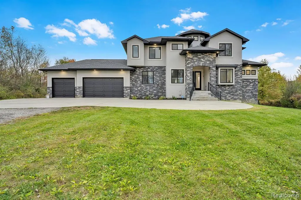 Lifestyle Meets Luxury in This Custom-Built Country Retreat! Discover a serene escape designed for entertaining and everyday comfort. Built in 2020, this stunning 5-bedroom, 4.5-bath custom home blends luxury and function with a spacious open layout, marble flooring, and elegant custom details throughout. The chef's kitchen features premium appliances, a gas cooktop with double oven, wine cooler, and microwave drawer with a large island with additional seating - perfect for hosting gatherings in style. Enjoy dual electric fireplaces in the dining and family rooms, a first-floor primary suite, and a private office with custom coffin ceilings. The finished lower level offers additional living space for recreation or relaxation. The builder spared no expense! Inside you will find 20' ceiling in the living room, 10' ceiling in the lower level walkout basement and 10' solid doors throughout. Energy-efficient Anderson composite windows frame tranquil country views, including a private pond stocked with bass and bluegill. This beautiful home on a 4.2 acre lot is conveniently located near expressways and local amenities. Come check out this peaceful retreat that offers the perfect balance of privacy and accessibility!