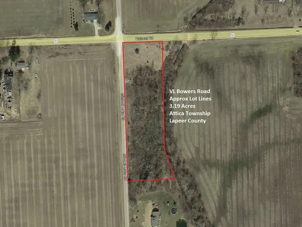Located right on the corner of Bowers Road & Mitchell Lake Road in beautiful Attica Twp, sits this recently split off 3.19 acre lot perfect for that rural country home build. This parcel is just North of downtown Attica and mere minutes from I-96 for quick and easy access to head either East or West. Most of the acreage is wooded and utilities are available at the road. No perk test has been done. Don't miss out on this great opportunity to own this large corner lot within Lapeer Community schools and call me today!