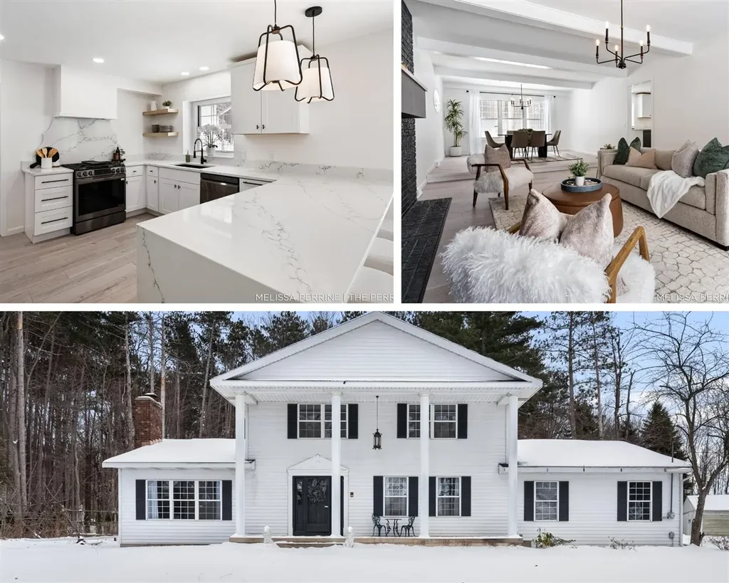 We are excited to present this lovely property. Tucked away on a peaceful 3-acre lot in Caledonia, this beautifully updated two-story home offers a rare mix of charm and modern upgrades. Surrounded by mature trees, a private pond, and a barn with horse stalls, the property provides both space and tranquility.Inside, the newly renovated kitchen stands out with waterfall quartz countertops, premium finishes, and updated flooring. Fresh paint, new lighting, and stylish fixtures throughout add a contemporary feel. The main level includes a flexible office or additional bedroom and a full bath, while upstairs, the primary suite features a tiled shower, soaking tub, and two additional bedrooms.