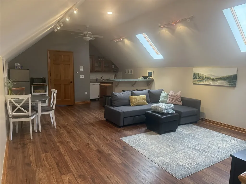 This rental property is a fully furnished apartment-style living space with a large living room with kitchenette and dining, one bedroom, a full bath, laundry. Light gray walls and gray laminate wood floors throughout.The apartment includes the following:- A spacious bedroom with a queen bed, two nightstands, a stand alone wooden closet with a full-length mirror, and a desk.- A spacious living area with a sofa bed, large TV and stand, a dining table; a kitchenette with sink, dishwasher and cabinets, an electric stove top and stool height countertop with two stools. Also, a fridge and microwave.- A full bath with shower and tub, tiled floor, sink and cabinet, and a towel storage closet.- A laundry area with washing machine and dryer.