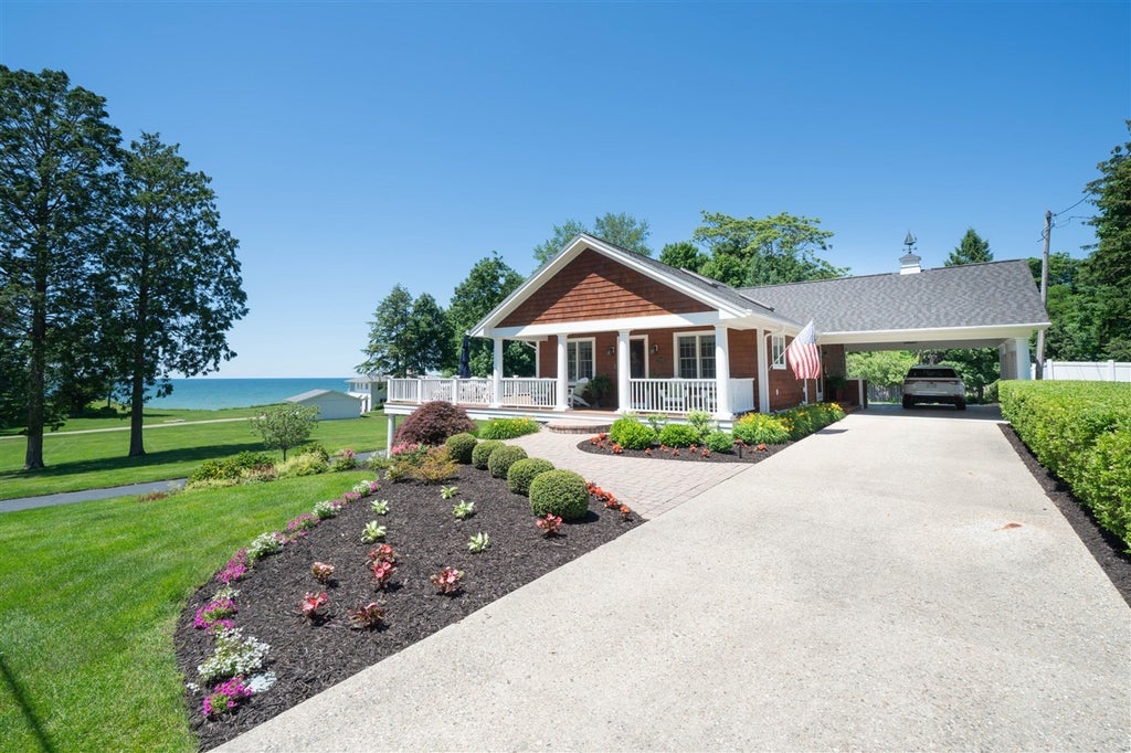 Stunning French Country Cottage with charm! Enjoy the fabulous Lake Michigan views from this classic home. Subdivision has deeded access to the lake a short distance away. Whether you are sitting on the spacious deck, or dining with friends by the warmth of the fieldstone fireplace in the professionally decorated great room, you cannot help but have a feeling of ''being home''. Unparalleled detail and customization in every room, the home includes an exceptional kitchen with custom cabinets, designer series appliances and a one of a kind gathering space that is welcoming and spacious. Kitchen also has an under counter wine fridge and large island to share good times. The home features 5 bedrooms and 3 full baths. Primary with bath on main floor walks out onto the deck.