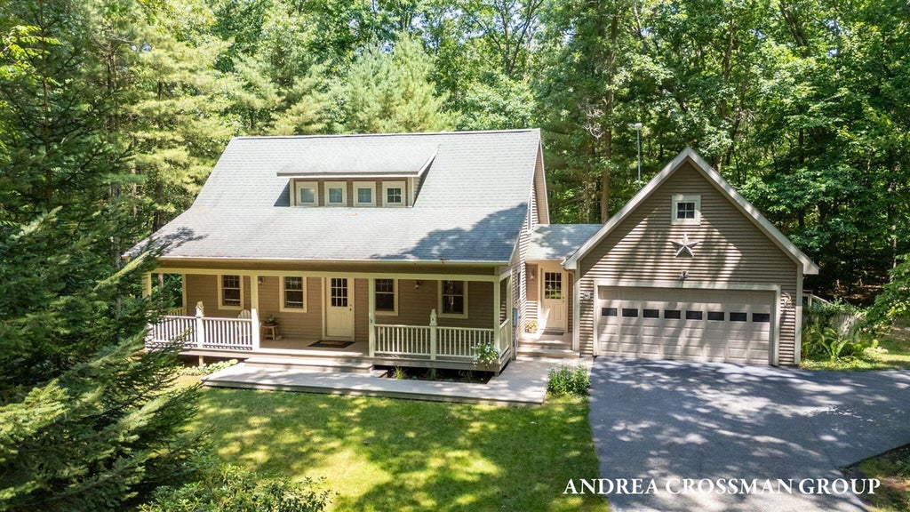 Tucked in a peaceful, wooded setting just minutes from downtown Saugatuck, this beautifully updated 2-bed, 2-bath retreat offers the perfect blend of privacy, nature, and convenience. Enjoy a quiet, tree-lined community while being moments from downtown's vibrant mix of boutique shops, art galleries, restaurants, and waterfront charm. The home features an open main level with a kitchen with updated appliances, dining area, and a vaulted living room with a freestanding gas stove fireplace set against a custom stone accent wall. A full bath and one bedroom complete this level. Upstairs, you'll find a cozy office loft with skylight, plus a second bedroom and full bath. Enjoy outdoor living from the back deck and covered front porch, or walk to the neighborhood gazebo overlooking the bayou.