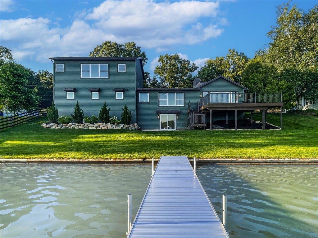 Rare opportunity on a sought-after lake! Experience the ultimate lakefront lifestyle with this fully remodeled custom house on Cobb Lake. This private, spring-fed, all-sports lake offers Bahama-like blue waters and a sandy bottom, perfect for swimming and water activities. Enjoy 90 feet of private lakefront with breathtaking views. The extra large deck overlooks the water, creating the perfect space for outdoor entertaining and relaxation. Inside, indulge in a bright modern space with custom cabinets, designer finishes, and California closets throughout. The primary bath boasts marble tiles and a freestanding tub. There's an additional 650 sqft. of finished, flexible space with flooring, lighting, electrical and pre plumbing--ready to customize as a gym, extra bedrooms, or even a bar.