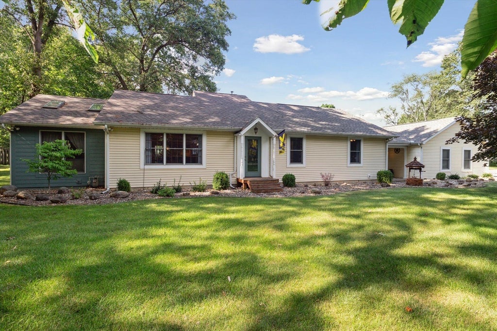 Welcome home to this beautifully updated 3 bedroom, 3 full bath retreat. With an inviting open floor plan and an expansive primary en suite, with a huge walk-in closet. Freshly painted throughout, the interior shines with abundant natural light, hardwood floors, and an open-concept design. The family room features vaulted ceilings, skylights, and a gorgeous stone fireplace. The kitchen boasts granite countertops, modern lighting, and a spacious pantry. Outdoors you can relax or entertain on the covered deck overlooking the beautifully landscaped yard with a sprinkler system, two fire pits, and a basketball hoop. You'll love the pristine heated 3-car tandem garage with epoxy floors, storage, and wash sink, plus a detached garage for even more space. Recent updates include new carpet (2025), roof (2023), stylish front door (2022), and water softener (2021). Centrally located with easy access to schools, shopping, dining, and commuter routes.
