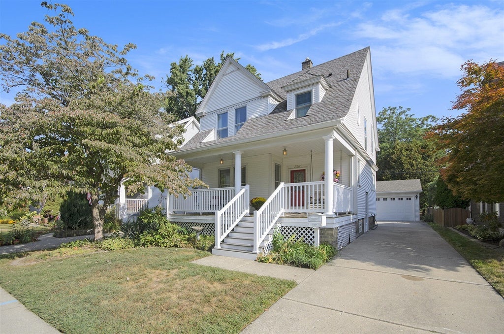 Back on market! Situated amongst beautifully preserved early 1900s homes, this well-crafted home, lovingly cared for by the same family for fifty years, blends classic details with thoughtful updates. A newly built, oversized covered porch with stately pillars complete with a charming porch swing invites you to enjoy morning coffee or relax at the end of the day. The exterior features newer vinyl siding, replacement windows, a concrete driveway with extra parking, and a brand-new 2.5-car garage complete with a 30-amp outlet. Inside, you'll be greeted by original oak hardwood floors and pine trim, a welcoming front living room, and a traditional dining room with a striking bow window. The bright kitchen offers backyard access with a deck and steps leading down to the yard. Upstairs, three comfortable bedrooms and a full bath provide space for family and guests
