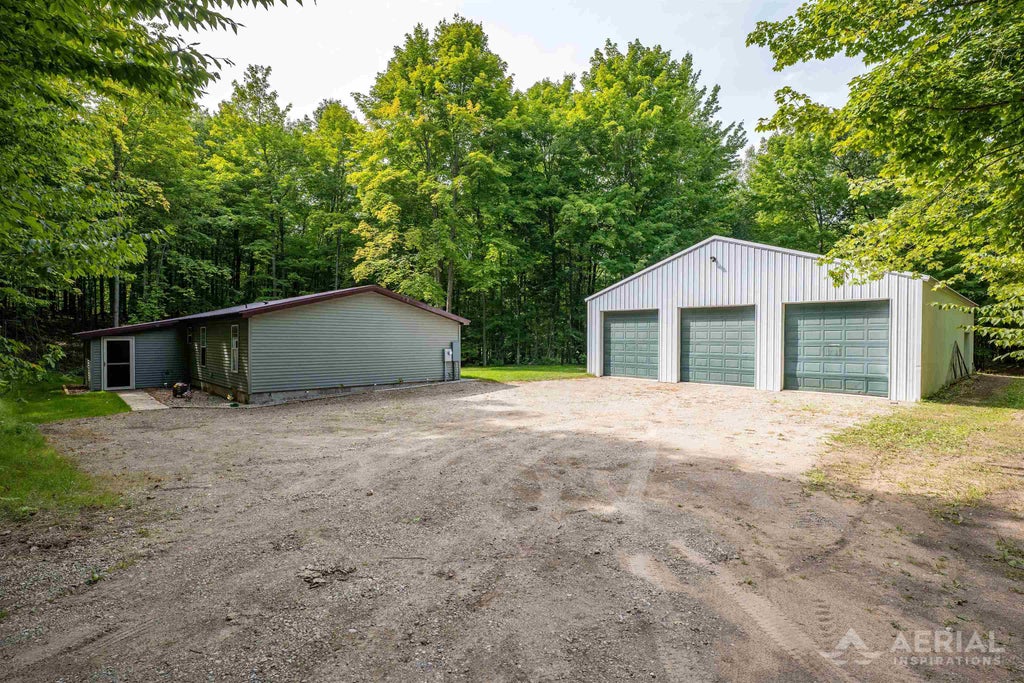 Beautiful 3 bedroom, 2 full bath home on almost 10 heavily wooded acres! Updated kitchen with gorgeous cupboards, island area with seating and stainless steel appliances. New carpet/flooring throughout. Primary bedroom has its own bath with knotty pine accent wall. 40x60 Pole Barn with cement floors, finished and power. Close to State Land for the outdoor enthusiast and hunter. New well, septic and electric service. Deck to sit back and relax. Watch the wildlife in your own back yard! Peaceful and quiet setting.