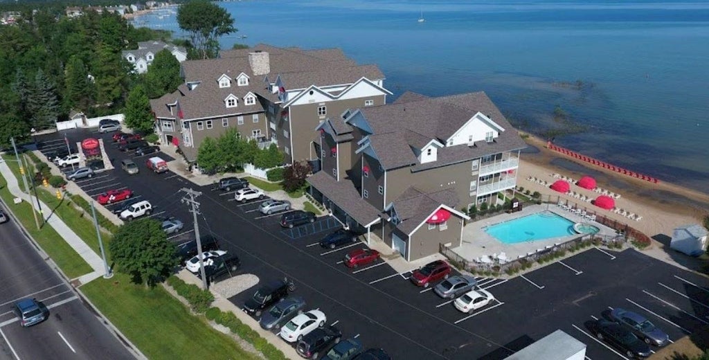 WATERFRONT VACATION CONDO with 404 ft. of sandy frontage on East Bay with 2 Pools & Spa's (inside & outside) + game room, gym, onsite laundry, volleyball, bonfire ring, lots of beachfront seating, snack room, breakfast room, event rooms coffee bar and much more. All located only about 5 miles from downtown, right across street from TART recreational trail, boat launch just down the street, and a short drive to VASA Trail golf courses, casino, snowmobile/ATV trails & tons of state land. Third floor end unit w/wrap around balcony overlooking sandy beach on East Bay and Old Mission Peninsula! Unit features kitchenette, large living room w/gas fireplace, large separate bedroom suite and bath w/dual vanity, large tile shower and jetted tub. This is 1/8 DEEDED ownership (6 weeks per year, one every other month - NOT a time share) you can use all yourself or rent with onsite rental mgt. out for additional income. Cash only.