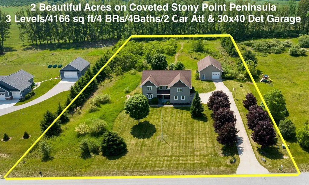 This large home on the coveted Stony Point Peninsula has something for everyone...oversized kitchen for all the chefs, gathering areas on each level to entertain...you even have room to give the guests some private space! Stunning 2 story fireplace, 4 bd 4 ba, 2 dens, lower-level walk-out with oversized wet bar, 2nd laundry, PLUS a 30x40 2nd outbuilding with 2nd floor attic storage! Lovely 2-acre manicured site to enjoy this peaceful countryside setting with underground sprinklers, mature landscaping, deck and patio! The Peninsula features a wonderful quality of life, perfect for those that enjoy walking & biking with its low traffic, and close proximity to beaches and all of Suttons Bay Village amenities including destination dining, & shopping. Extras include boiler fired in-floor heat (amazing...) throughout, + a furnace and A/C! Note this desirable neighborhood has County maintained roads, low assn fees, & so...close to the beaches, shopping, theater, Leelanau Trail, houses of worship, wineries, cideries, & just minutes to golf. This is a community worth joining with a rural, peaceful quality of life & all the amenities are so...close!