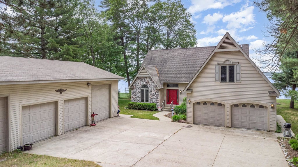 Custom Lakefront Home on Van Etten Lake – 2,894 Sq Ft of Quality and Comfort! A beautifully crafted 3+bedrooms, 2.5 bath custom home with a large bonus room offers luxury living on 120 feet of Van Etten Lake frontage. Designed with high-end finishes and energy efficiency, the home features a spacious main-floor primary suite with walk-in closets, skylights, a low-threshold walk-in shower and a connected solarium featuring a hot tub and workout space for a retreat feel. The gourmet kitchen includes granite countertops, an island with vegetable sink, dual disposals, pantry, desk area, wall oven, cooktop, microwave, and stunning lake views. A grand foyer, den/office, and family room with a custom oak fireplace, and laundry room complete the main level. Upstairs are two additional bedrooms with walk-in closets, a full bath, and a large bonus room suitable for a 4th bedroom or flex space such as a media room or hobby area. Built for comfort and efficiency, the home includes six-inch walls with chemical-free insulation, Low-E windows, 15†attic insulation, a programmable thermostat, central vacuum, water softener and ceiling fans throughout enhance year-round airflow. The beautifully landscaped yard features a stamped concrete patio, porch, deck, built-in grill, perennial gardens, underground sprinklers, and a dedicated plant irrigation system. The 120-foot steel seawall and 70-foot dock (negotiable) provide ideal easy access to the lake. A concrete driveway leads to a two-car attached garage and a pole barn featuring three spacious bays, a 30x38 heated and insulated workshop, and a 30x12 storage area. Includes 100 AMP and 220V electric service, gas force air heat, frost free water supply, an air-over-hydraulic in-ground two-post vehicle lift, a 220V air compressor, heavy duty overhead I-beam with rolling trolley and chain fall, and more! A finely built, well appointed lakefront home with style, function, and features designed to enhance your everyday life year-round!