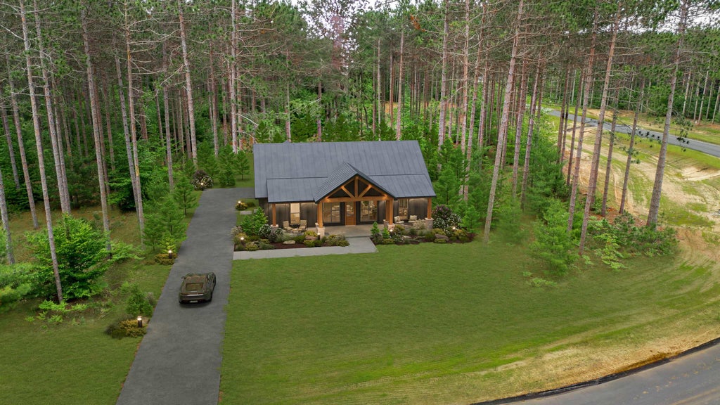 Welcome to Cascade Trail, a rare new construction opportunity nestled among the towering red pines of Long Lake Township, just minutes from downtown Traverse City. Set on a private 1-acre wooded lot, the Timber Cottage blends modern comfort with rustic charm in one of northern Michigan’s most desirable new developments. This thoughtfully designed home offers 1,793 square feet of main-level living, with three bedrooms, two full bathrooms, and a full unfinished basement ready for future expansion. Highlights include a vaulted great room with exposed timber beams and a cozy gas fireplace, a spacious kitchen with a center island and walk-in pantry, and a luxurious primary suite with a spa-style bath and oversized walk-in closet. Covered front and rear porches provide ideal spaces for relaxing or entertaining in the peaceful forest setting. Located in the new Cascade Trail community, the property features paved roads, underground utilities—including natural gas and high-speed cable—and is just a short walk to Westwoods Elementary. With nearby public lake access, hiking trails, and downtown Traverse City just minutes away, this is a rare chance to enjoy nature, privacy, and convenience in one complete package. Early buyers have the option to select finishes and personalize design elements—reserve your Timber Cottage today.