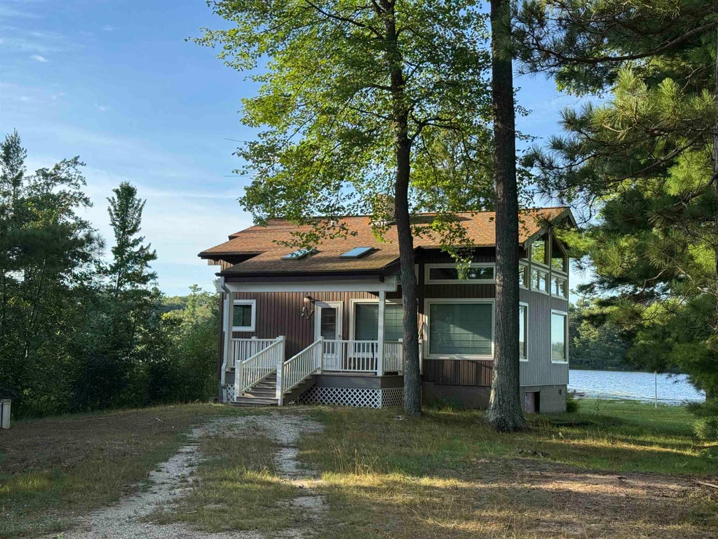 Waterfront home on 2 lots with approximately 102' of frontage on beautiful Fife Lake! Home has an open living room and dining room with vaulted beamed ceilings and panoramic views through multiple large windows. The home features a wood burning fireplace to cozy up to on cool nights. Master bedroom, bath, and laundry are all on the 1st floor. Sliding glass doors lead you out onto a large deck where you can have your morning coffee and view much wildlife including eagles that nest on Helen Island. The spiral staircase leads you to the 2nd bedroom and 1/2 bath. Also, upstairs you will find an extra room for storage or for extra guests to sleep. This home sits on 2 large lots with a 2 car detached garage on the vacant lot next to the home along with a storage shed. There is also a 1 car garage with an additional shed on the lot that the home sits on. The home has beautiful views of both islands and the Fife Lake sand bar. This home is close to thousands of acres of state land and the Manistee River.