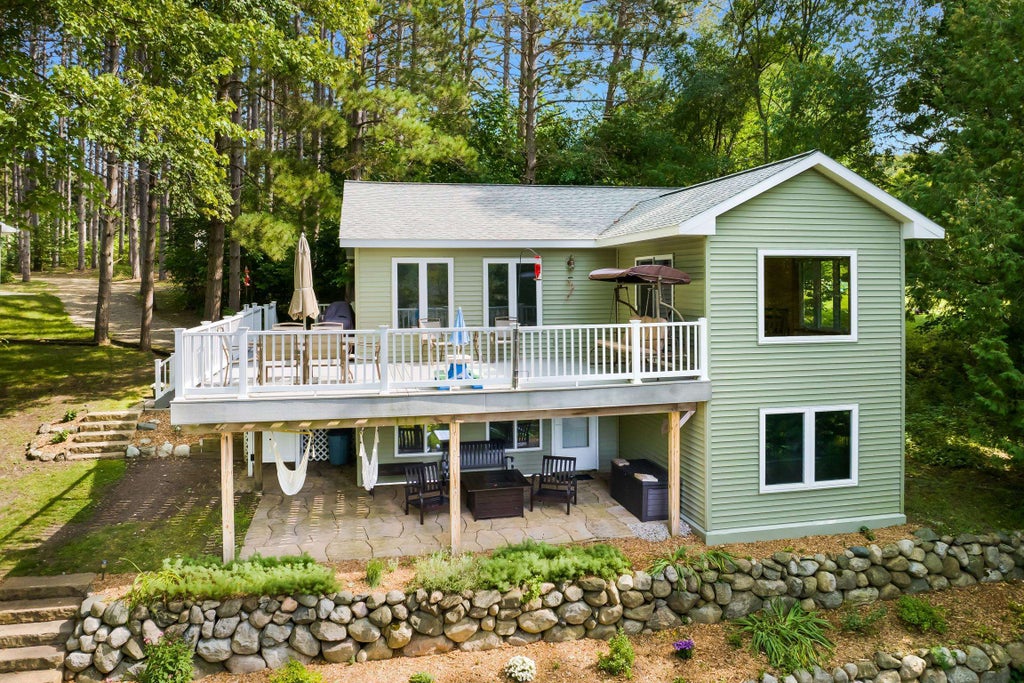 This amazing Wilson Lake home has it all! 150 ft private frontage located on Upper Chain of Lakes on an estate size parcel offering privacy and tranquility. Home recently totally and tastefully renovated featuring gourmet Island kitchen with quartz counter tops, custom cabinets and stainless steel appliances, open floor plan with picturesque Lake views, formal dining room, master en suite, fireplace, wrap around Trex decking with vinyl railing plus flagstone patio, central air, Lower level kitchenette and great room, True Stream Wi-Fi, whole house generator, two full size garages, winding scenic path to lakefront where you’ll find gazebo w/electric and decking at waters edge, top line floating dock, which stays in all year. To top it off small sand bottom swimming area for the kids along with outdoor shower and most furnishings included. This home screams of owners pride and truly has it all, a definite must see to appreciate.