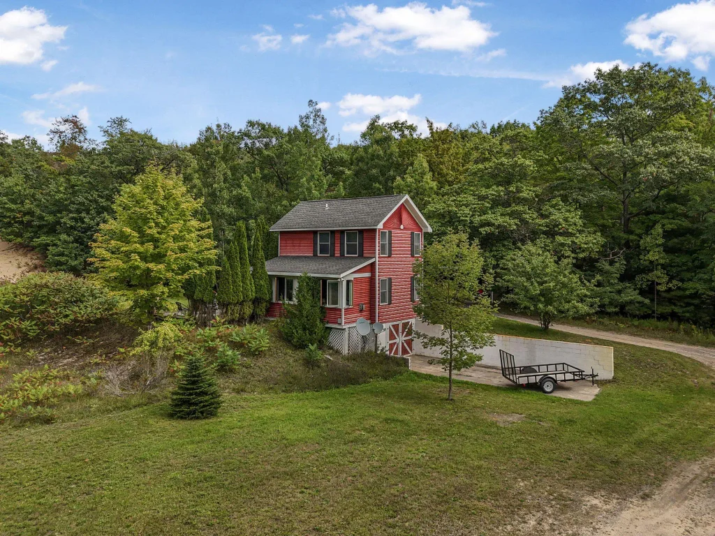 Presenting a unique, elevated farmhouse on 3 acres, just north of Leland! This simple, 1 bedroom / 1.5 bathroom residence is perched at the edge of a beautiful dune-like clearing, and is accessed via shared driveway easement off of scenic M22. The kitchen, living room with fireplace, dining area, and half bathroom are located on the main floor, which opens to a private deck - a delightful location to enjoy views of the yard and take in the sounds of nearby Lake Michigan. Upstairs, the primary bedroom has a vaulted ceiling, clad in wood tongue and groove paneling. This space is bright and cheerful, featuring numerous windows with views of the surrounding dune and woods. A full bathroom and walk-in closet with washer and dryer complete this upper floor. On the lowest level, a workshop and storage area walkout to grade through wooden barn doors. This home is a cosmetic fixer-upper with excellent bones and endless potential, just waiting for your personal touch and updates. Don’t miss your chance to live near beautiful Leland! Full associated documents include an inspection report.
